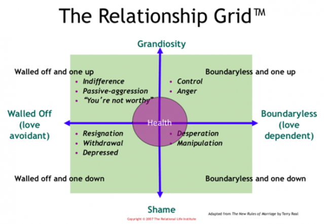 In our first session, I almost always introduce Real’s Relationship Grid to help us get on the same page about key dynamics present in the relationship. Do you view yourself as better than your partner (“one up”) or unworthy of them (“one down”)? And how does your partner view and treat you? We often aren’t aware of the answers to these questions, but if your partner thinks you aren’t worthy of them, you are both probably pretty miserable.